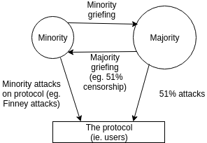 The diagram shows three constituencies - the minority, the majority and the protocol (ie. users), and four arrows representing possible adversarial actions: the minority attacking the protocol, the minority attacking the majority, the majority attacking the protocol, and the majority attacking the minority. Examples of each include: