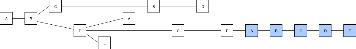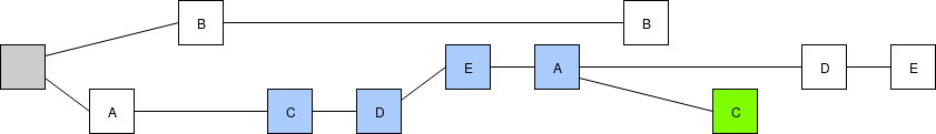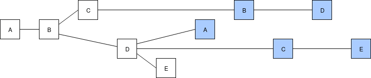 Note that all four of the validators could have seen one or both of \(B\)'s blocks, and \(D\) and \(E\) could have seen \(C\)'s second block, making that the latest message in their views instead of \(C\)'s first block; however, the structure of the chain itself gives us no evidence that they actually did. Fortunately, as we will see below, this ambiguity does not matter for us.
