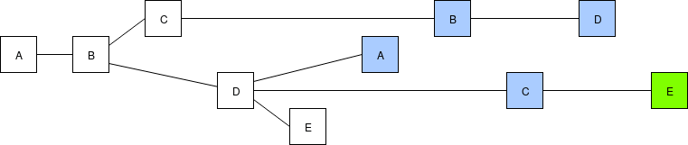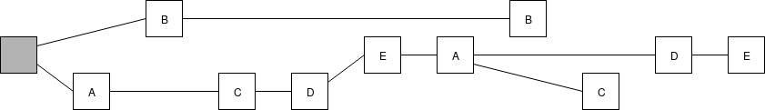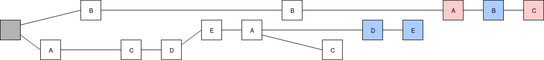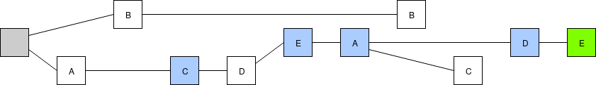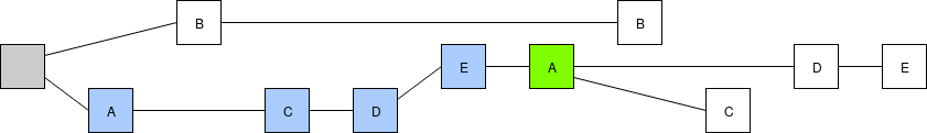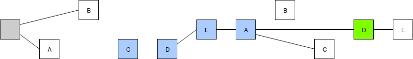 We will take this one step at a time. First, we replace the fork choice rule (the rule that chooses which chain among many possible choices is "the canonical chain", ie. the chain that users should care about), moving away from the simple longest-chain-rule and instead using "latest message driven GHOST". To show how LMD GHOST works, we will modify the above example. To make it more concrete, suppose the validator set has size 5, which we label \(A\), \(B\), \(C\), \(D\), \(E\), so validator \(A\) makes the blocks at slots 0 and 5, validator \(B\) at slots 1 and 6, etc. A client evaluating the LMD GHOST fork choice rule cares only about the most recent (ie. highest-slot) message (ie. block) signed by each validator: