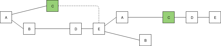 Dotted lines are uncle links, eg. when E creates a block, E notices that C is not yet part of the chain, and so includes a reference to C.