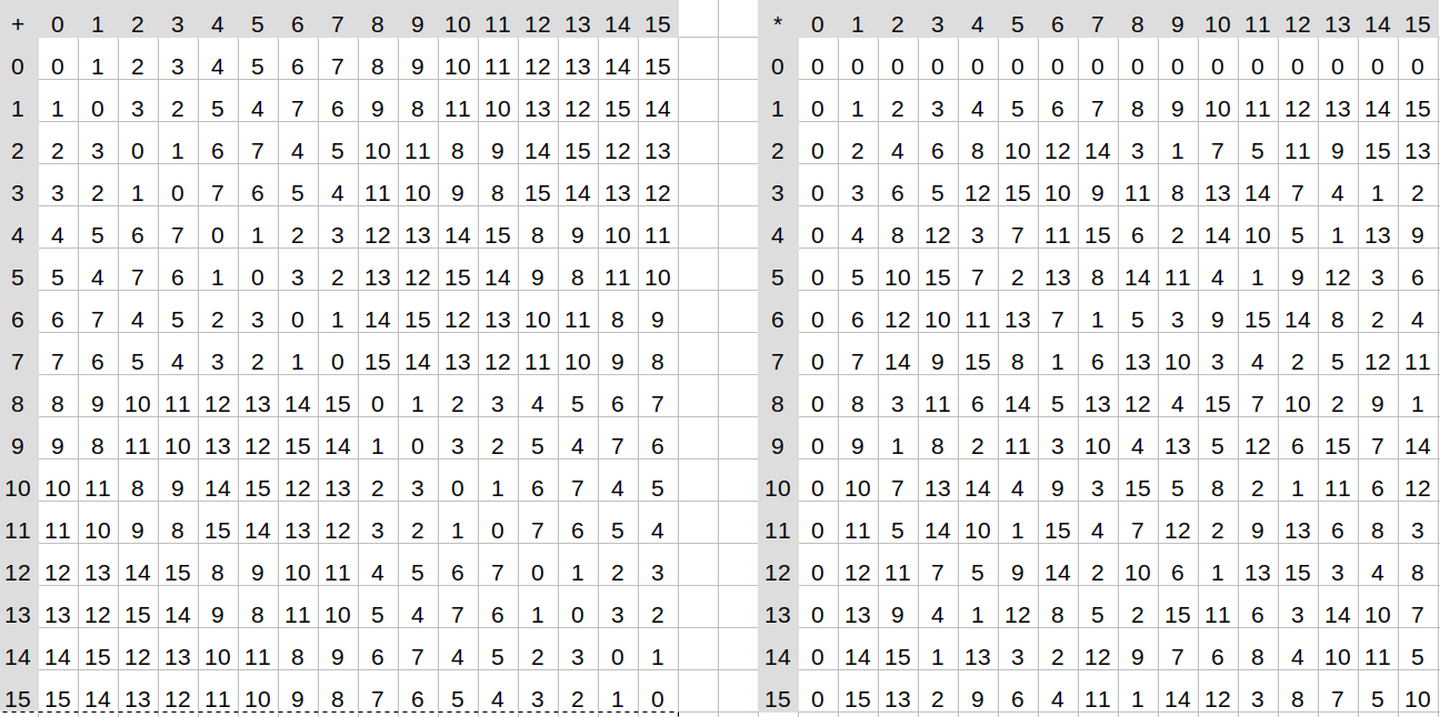 Addition and multiplication tables for the binary field mod \(x^4 + x + 1\). Field elements are expressed as integers converted from binary (eg. \(x^3 + x^2 \rightarrow 1100 \rightarrow 12\))