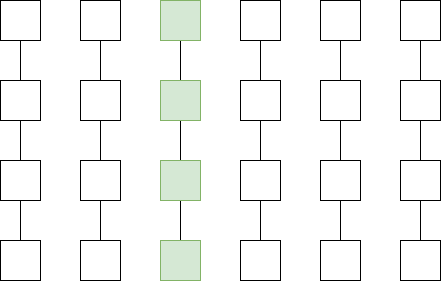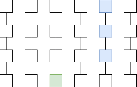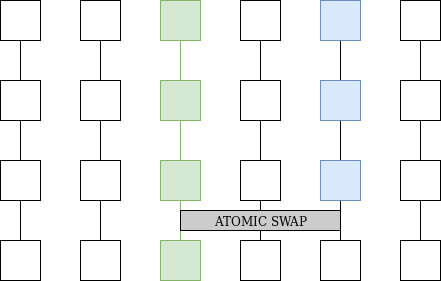 Left: History data a Plasma Cash user needs to store if they own 1 coin. Middle: History data a Plasma Cash user needs to store if they own 1 coin that was exchanged with another coin using an atomic swap. Right: History data a Plasma Cash user needs to store if the order matching is published on chain.