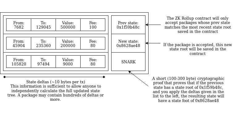 Anatomy of a ZK Rollup package that is published on-chain. Hundreds of "internal transactions" that affect the state (ie. account balances) of the ZK Rollup system are compressed into a package that contains ~10 bytes per internal transaction that specifies the state transitions, plus a ~100-300 byte SNARK proving that the transitions are all valid.