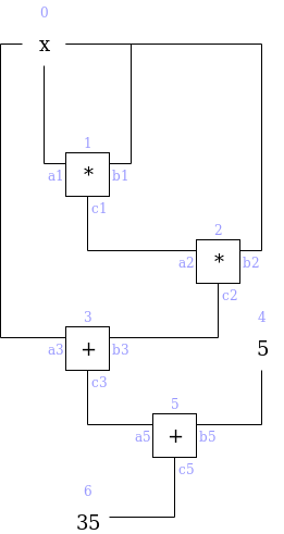 Let us start with an explanation of how PLONK works, in a somewhat abstracted format that focuses on polynomial equations without immediately explaining how those equations are verified. A key ingredient in PLONK, as is the case in the QAPs used in SNARKs, is a procedure for converting a problem of the form "give me a value \(X\) such that a specific program \(P\) that I give you, when evaluated with \(X\) as an input, gives some specific result \(Y\)" into the problem "give me a set of values that satisfies a set of math equations". The program \(P\) can represent many things; for example the problem could be "give me a solution to this sudoku", which you would encode by setting \(P\) to be a sudoku verifier plus some initial values encoded and setting \(Y\) to \(1\) (ie. "yes, this solution is correct"), and a satisfying input \(X\) would be a valid solution to the sudoku. This is done by representing \(P\) as a circuit with logic gates for addition and multiplication, and converting it into a system of equations where the variables are the values on all the wires and there is one equation per gate (eg. \(x_6 = x_4 \cdot x_7\) for multiplication, \(x_8 = x_5 + x_9\) for addition).