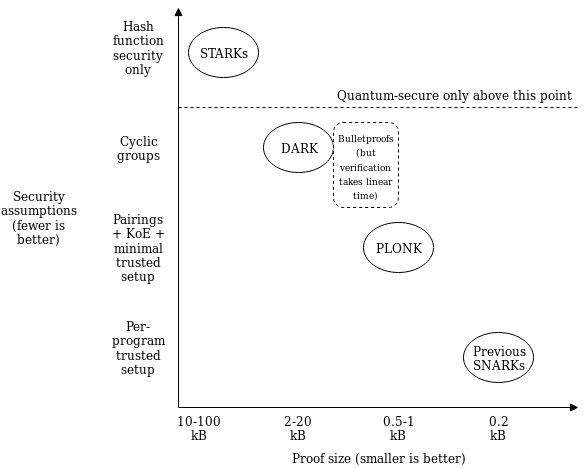 But there are more recently other types of polynomial commitments coming out too. A new scheme called DARK ("Diophantine arguments of knowledge") uses "hidden order groups" such as class groups to implement another kind of polynomial commitment. Hidden order groups are unique because they allow you to compress arbitrarily large numbers into group elements, even numbers much larger than the size of the group element, in a way that can't be "spoofed"; constructions from VDFs to accumulators to range proofs to polynomial commitments can be built on top of this. Another option is to use bulletproofs, using regular elliptic curve groups at the cost of the proof taking much longer to verify. Because polynomial commitments are much simpler than full-on zero knowledge proof schemes, we can expect more such schemes to get created in the future.