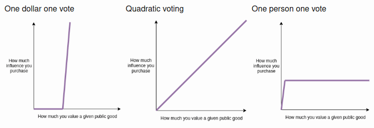 A diagram from my post on quadratic payments showing how quadratic payments is "in the middle" between the extremes of voting-like systems and money-like systems, and avoids the worst flaws of both.