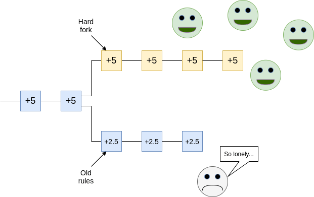 However, I believe this "individualist" view to be very wrong. To see why, let us take a look at the scenario that we are worried about: the vast majority of participants accept some change to protocol rules that you find unacceptable. For example, imagine a future where transaction fees are very low, and to keep the chain secure, almost everyone else agrees to change to a new set of rules that increases issuance. You stubbornly keep running a node that continues to enforce the old rules, and you fork off to a different chain than the majority.