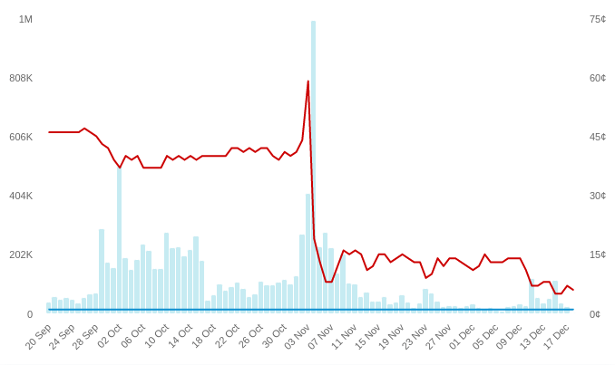 But what I could not have imagined at the time was that the election itself was just the beginning. A few days after the election, Biden was declared the winner by various major organizations and even a few foreign governments. Trump mounted various legal challenges to the election results, as was expected, but each of these challenges quickly failed. But for over a month, the price of the NTRUMP tokens stayed at 85 cents!