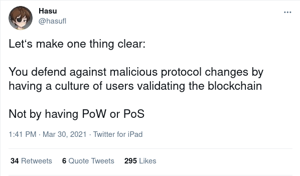 Can this happen on your blockchain? The elites of your blockchain community, including pools, block explorers and hosted nodes, are probably quite well-coordinated; quite likely they're all in the same telegram channels and wechat groups. If they really want to organize a sudden change to the protocol rules to further their own interests, then they probably can. The Ethereum blockchain has fully resolved consensus failures in ten hours; if your blockchain has only one client implementation, and you only need to deploy a code change to a few dozen nodes, coordinating a change to client code can be done much faster. The only reliable way to make this kind of coordinated social attack not effective is through passive defense from the one constituency that actually is decentralized: the users.