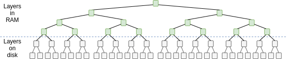Don't take this diagram too literally; different databases work in different ways, and often the part in memory is just a single (but big) layer (see LSM trees as used in leveldb). But the basic principles are the same.