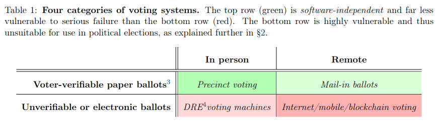The recent MIT paper criticizing blockchain voting includes this helpful table, depicting any form of paperless voting as being fundamentally too difficult to secure: