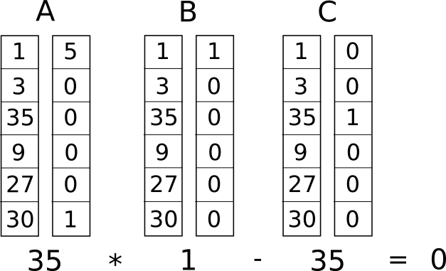An R1CS instance with a single constraint (so \(A\), \(B\) and \(C\) have width 1), with a satisfying \(Z\) vector, though notice that here the \(Z\) appears on the left and has 1 in the top position instead of the bottom.