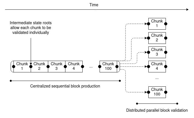 transactions in a block are split into 100 buckets, with a Merkle or Verkle tree state root after