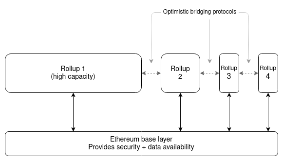 No single rollup succeeds at holding anywhere close to the majority of Ethereum activity. Instead, they all top out at a few hundred transactions per second. We get a multi-rollup future for Ethereum - the Cosmos multi–chain vision, but on top of a base layer providing data availability and shared security. Users frequently rely on cross-rollup bridging to jump between different rollups without paying the high fees on the main chain. What would that world look like?