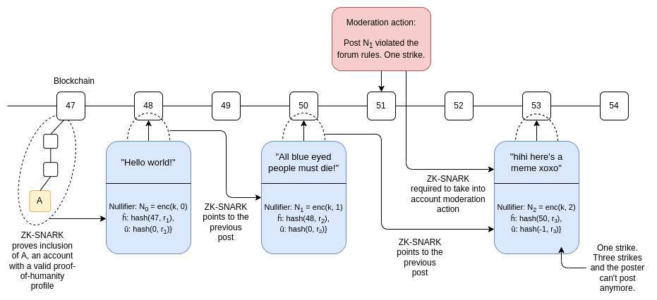 Suppose that we want to build 0chan, an internet forum which provides full anonymity like 4chan (so you don't even have persistent names), but has a reputation system to encourage more quality content. This could be a system where some moderation DAO can flag posts as violating the rules of the system and institutes a three-strikes-and-you're-out mechanism, it could be users being able to upvote and downvote posts; there are lots of configurations.