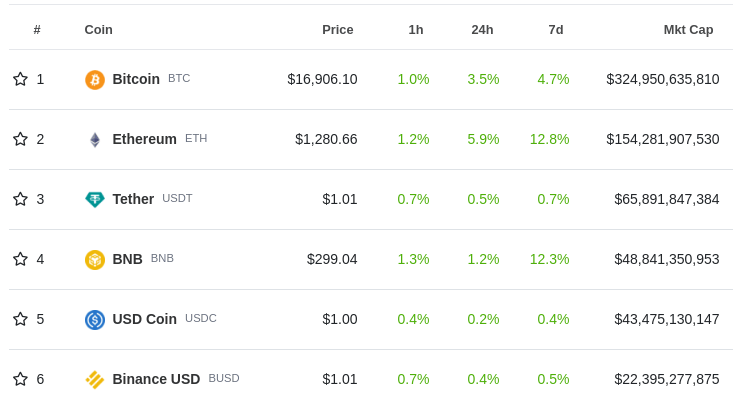 Top cryptocurrency market caps, data from CoinGecko, 2022-11-30. Three of the top six are centralized stablecoins.