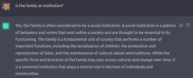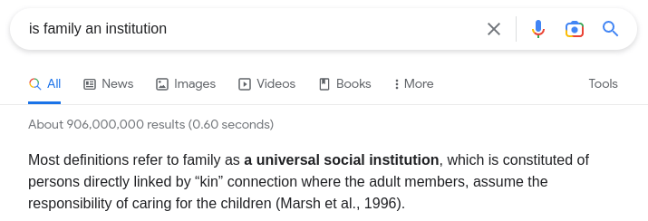 The word "institution" in political discourse brings to mind things like national governments, the New York Times, universities and maybe the local public library. But the word also gets used to describe other kinds of things. The phrase "the institution of marriage" is common in English-language discourse, and gets over two million search results on Google. If you ask Google point-blank, "is family an institution", it answers yes.