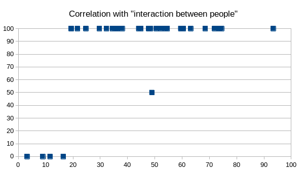 But as it turns out, the correlations are misleading. "Interaction between people" turns out to be an almost unquestionably necessary property for something to have to be an institution. The correlation of 0.57 kind of shows it, but it understates the strength of the relationship:
