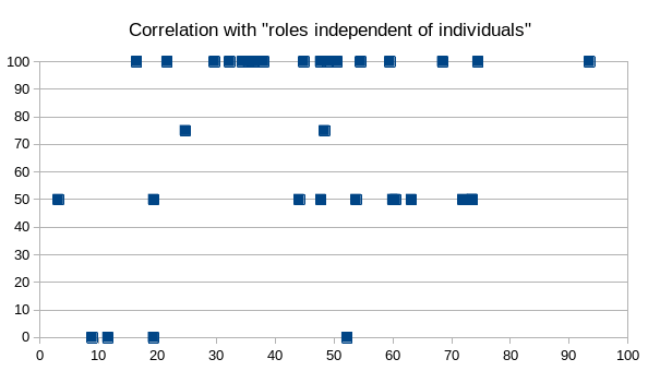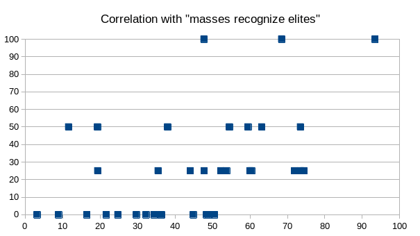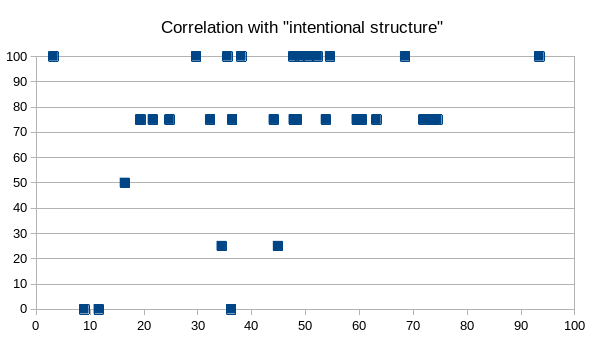 Correlations with "masses recognize elites" and "elites oversee experts" were high; higher for the second than the first, though perhaps Hanson and I had different meanings in mind for "recognize". The "intentional structure" chart has an empty bottom-right corner but a full top-left corner, suggesting that intentional structure is necessary but not sufficient for something to be an institution.