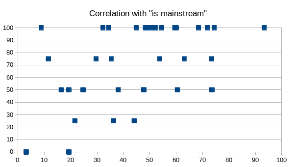 Literally every thing that I labeled as clearly involving interaction had a higher percentage of people considering it an institution than every thing I labeled as not involving interaction. The single dot in the center is my hypothetical example of an island where people with odd-numbered birthdays are not allowed to eat meat before 12:00; I didn't want to give it 100% because the not-meat-eating is a private activity, but the question still strongly implies some social or other pressure to follow the rule so it's also not really 0%. This is a place where Spearman's coefficient outperforms Pearson's, but rather than spurting out exotic numbers I'd rather just show the charts. Here are the other six: