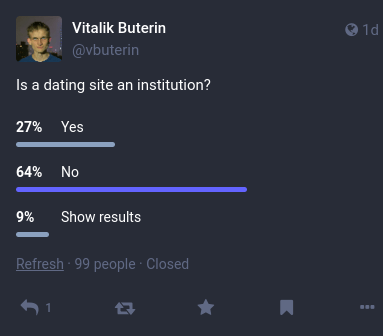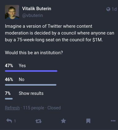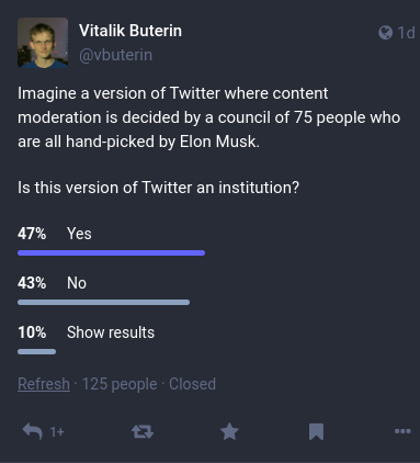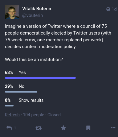 The most surprising finding for me is that "roles independent of individuals" is by far the weakest correlation. Twitter run by a democracy is the most institution-y of all, but Twitter run by a pay-to-govern scheme is as institution-y as Twitter that's just run by Elon directly. Roles being independent of individuals adds a guarantee of stability, but roles being independent of individuals in the wrong way feels too unfamiliar, or casual, or otherwise not institution-like. Dating sites are more independent of individuals than professional matchmaking agencies, and yet it's the matchmaking agencies that are seen as more institution-like. Attempts at highly role-driven and mechanistic credibly-neutral media, (eg. this contraption, which I actually think would be really cool) just feel alien - perhaps in a bad way, but also perhaps in a good way, if you find the institutions of today frustrating and you're open-minded about possible alternatives.
