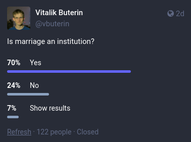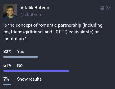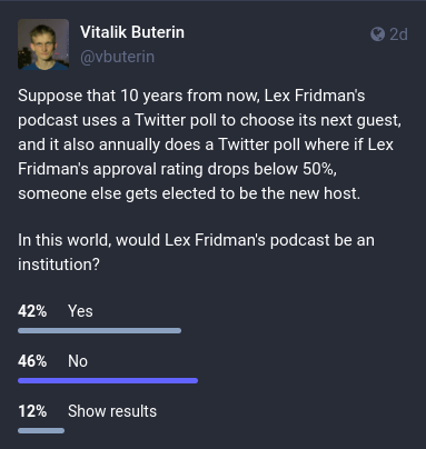Support for (2) probably maps closely to Pourteaux's "techno-optimist" vs "techno-minimalist" distinction. Techno-minimalists don't see things like Twitter, Substack, Bitcoin, Ethereum, etc as part of the solution, though there are "Bitcoin minimalists" who see the Bitcoin blockchain as a narrow exception and otherwise want to see a world where things like family decide more of the outcomes. "Techno-optimist anti-institutionalists" are specifically engaged in a political project of either trying to replace (1) with the right kind of (2), or trying to reform (1) by introducing more elements of the right kind of (2).
