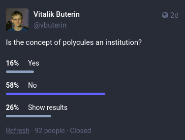 The challenge with avoiding structures entirely is clear: prisoner's dilemmas exist and we need incentives. The challenge with small-scale and informal structures is often clear: economies of scale and gains from standardization - though sometimes there are other benefits from informal approaches that are worth losing those gains. The challenge with simply swapping the elites is clear: it has no path to socially scale into a cross-tribal consensus. If the goal is not to enshrine a new set of elites forever, but for elites to permanently be high-churn (cf. Balaji's founder vs inheritor dichotomy), that is more credibly neutral, but then it starts getting closer to the territory of avoiding enshrined elites in general.