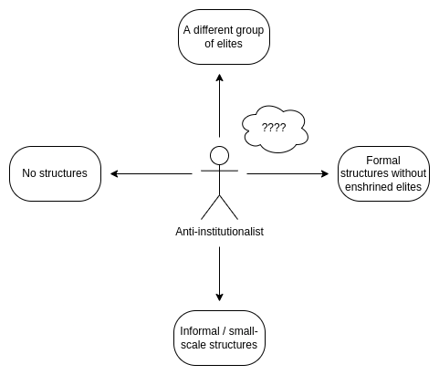 It would be wrong to ascribe too much intentional strategy to anti-institutionalists: anti-institutionalism is a movement that is much more united in what is against than in support of any specific particular alternative. But what is possible is to recognize this pattern, and ask the question of which paths forward make sense for anti-institutionalists.
