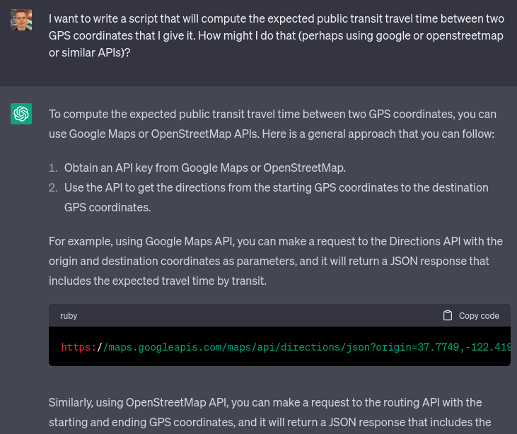 ChatGPT 3.5 worked impressively well this time; it certainly stumbled and fell much less than my previous misadventure, where I tried to get it to help me convert IPFS bafyhashes into hex. In general, ChatGPT seems uniquely good at teaching me about libraries and APIs I've never heard of before but that other people use all the time; this reduces the barrier to entry between amateurs and professionals which seems like a very positive thing.