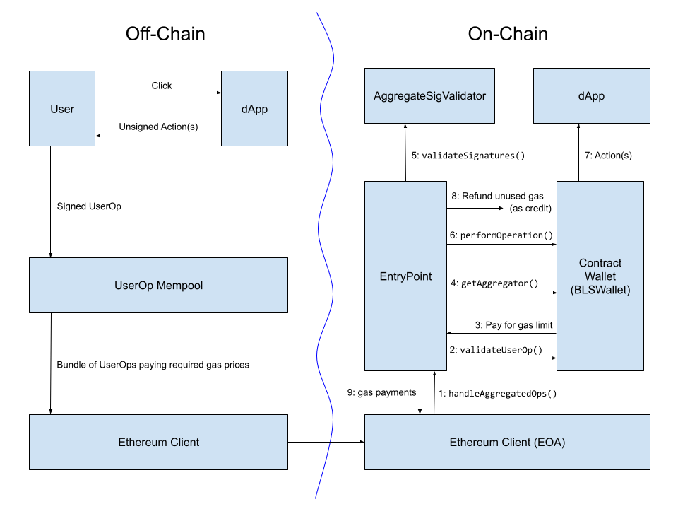 Diagram from a BLS wallet implementation post showing the workflow of BLS aggregate signatures within an earlier version of ERC-4337. The workflow of aggregating cross-chain proofs will likely look very similar.