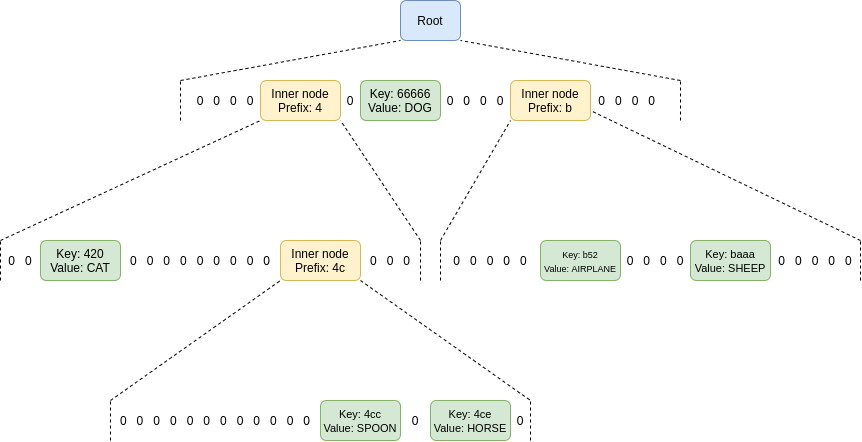 What a Verkle tree looks like. In practice, you might give each node a width of 256 == 2⁸ for IPA-based trees, or 2²⁴ for KZG-based trees.
