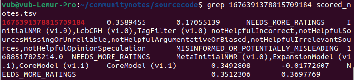 1676391378815709184. We then search for that in thescored_notes.tsvandnote_status_history.tsvfiles generated by running the algorithm. We get:The second column in the first output is the note's current rating. The second output shows the note's history: its current status is in the seventh column (