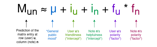 For any given note, most users have not rated that note, so most entries in the matrix will be zero, but that's fine. The goal of the algorithm is to create a four-column model of users and notes, assigning each user two stats that we can call "friendliness" and "polarity", and each note two stats that we can call "helpfulness" and "polarity". The model is trying to predict the matrix as a function of these values, using the following formula:
