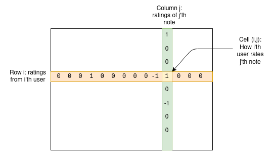 users and a set of notes; we can create a matrix \(M\), where the cell \(M_{i,j}\) represents how the i'th user