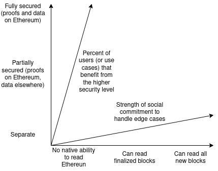 Notice that both dimensions each have two distinct ways of measuring them (so really there's four dimensions?): security of withdrawing can be measured by (i) security level, and (ii) what percent of users or use cases benefit from the highest security level, and security of reading can be measured by (i) how quickly the chain can read Ethereum's blocks, particularly finalized blocks vs any blocks, and (ii) the strength of the chain's social commitment to handle edge cases such as 51% attacks and hard forks.