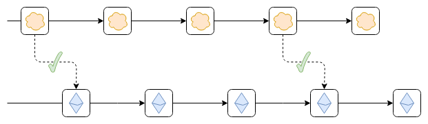 Suppose that, as shown in the diagram, the Ethereum chain reverts. This could be a temporary hiccup within an epoch, while the chain has not finalized, or it could be an inactivity leak period where the chain is not finalizing for an extended duration because too many validators are offline.