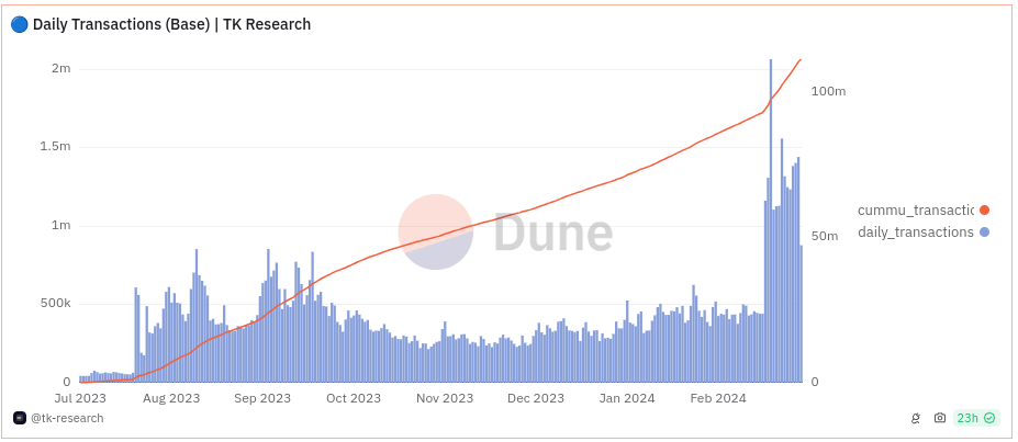 Once the Dencun hard fork activated, making rollups set up to use the blobs that it introduced 100x cheaper. usage on the Base rollup spiked up immediately:
