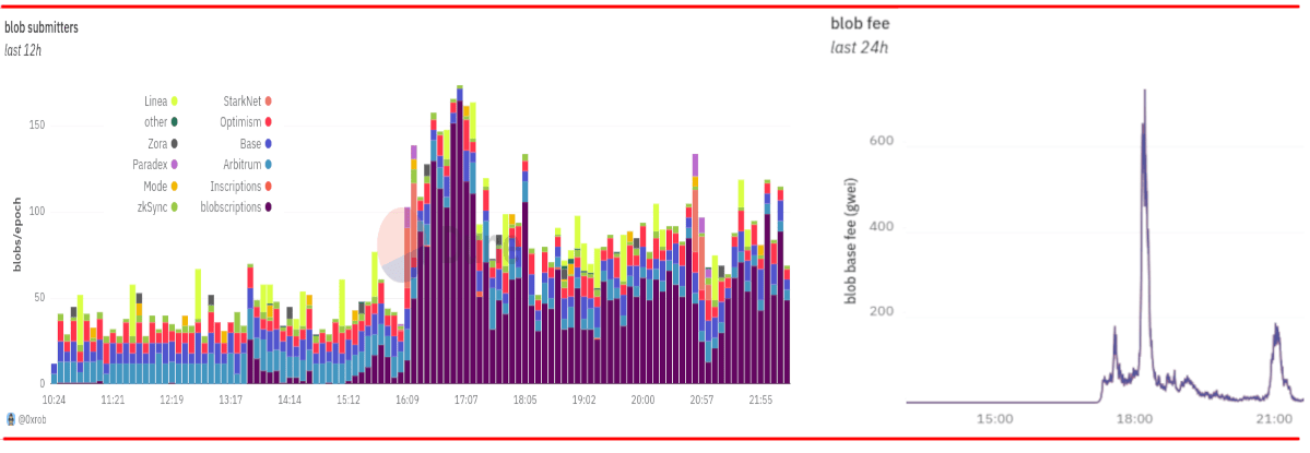 2024 Mar 28 See all postsOn March 13, the Dencun hard fork activated, enabling one of the long-awaited features of Ethereum: proto-danksharding (aka EIP-4844, aka blobs). Initially, the fork reduced the transaction fees of rollups by a factor of over 100, as blobs were nearly free. In the last day, we finally saw blobs spike up in volume and the fee market activate as the blobscriptions protocol started to use them. Blobs are not free, but they remain much cheaper than calldata.