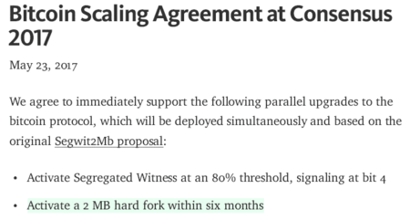 The New York Agreement, signed by major Bitcoin exchanges, payment processors, miners and other companies in 2017. A key example of what small blockers consider to be an attempt to shift Bitcoin from rule by users to rule by corporate cabal.
