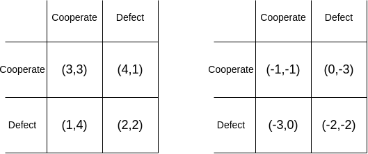 In economic theory, there is no difference between these two prisoner's dilemmas: the game on the right can be viewed as being the game on the left plus a separate (irrelevant) step where both players lose four points regardless of how they act. But in human psychology, the two games can be very different.