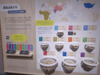 What particularly strikes me about the exhibits is the way in which they invite people to actively learn and participate. The informational exhibits all strive to present information in a way that makes it tangible and easier for people to understand important details, and consequences, of each problem. A section on overfishing features the complaint "I like sushi ... but we may not be able to eat sushi casually in the future, right?". At least two of the exhibits end with an interactive section, which asks a question related to the content and invites people to provide their own answers. An exhibit on solving the Earth's resource problems takes the form of a game.